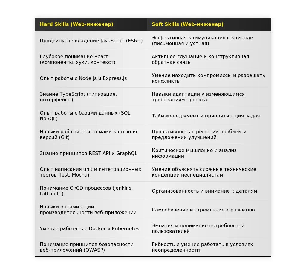 - Укажите желаемую должность: Вместо общих фраз, таких как "опытный web-инженер", напишите "Frontend Web-инженер (React)" или "Backend Web-инженер (Node.js)".