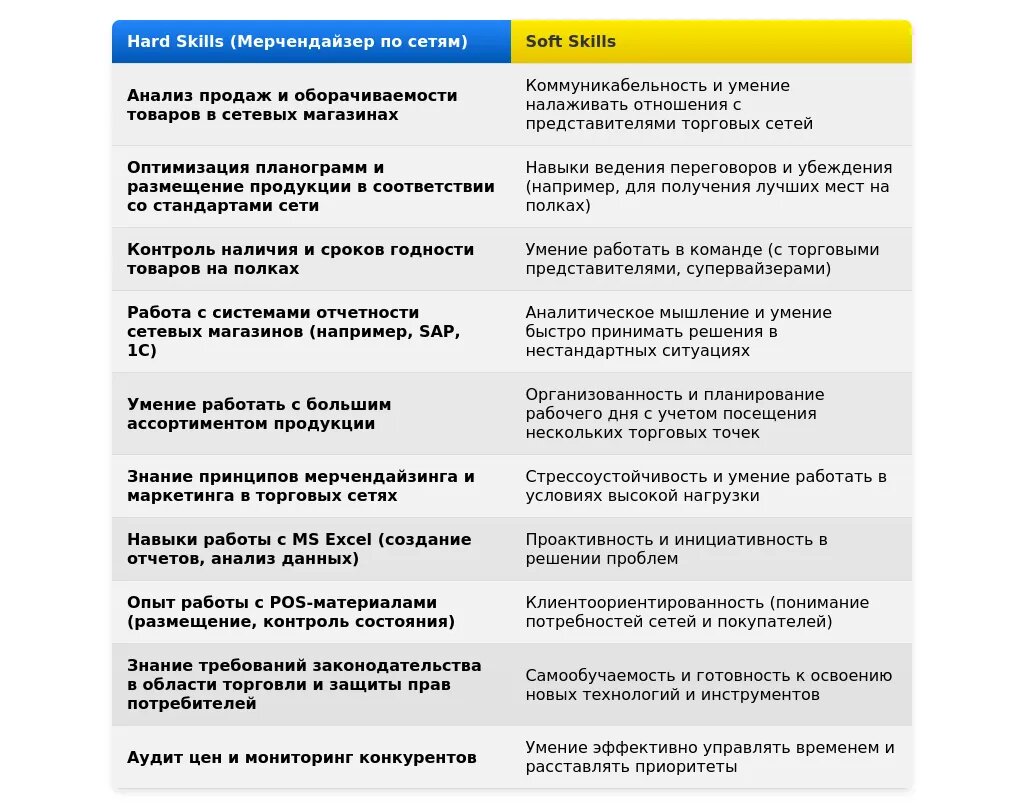 - Для вакансий в крупные сети: "Опыт работы с планограммами", "знание стандартов выкладки товара", "опыт работы с большим ассортиментом продукции", "умение работать в команде".