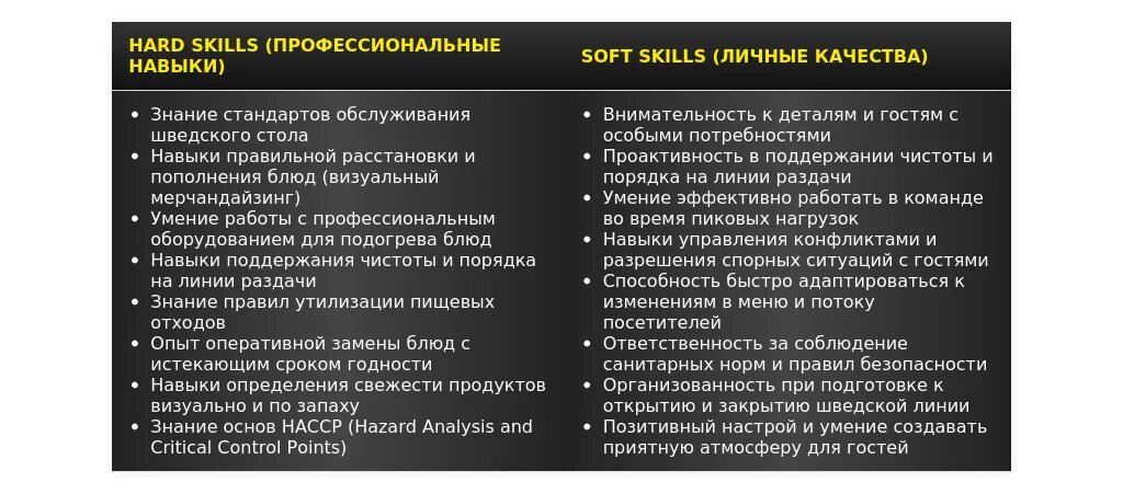 Ключевые навыки и сильные стороны, релевантные для позиции официанта шведского стола.
