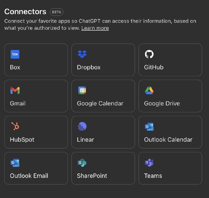 С анонсом Connectors в ChatGPT все больше хочется подключить team-план, чтобы подключить вот это вот все. Это супер-удобно и давно напрашивалось. Я бы добавил еще разве что Notion для полного счастья. Кстати, кто-нибудь использует team-подписку?
