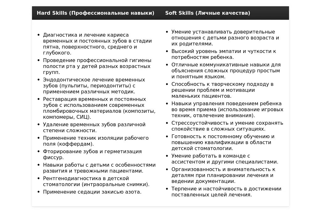 Ключевые навыки и компетенции, важные для детского стоматолога-терапевта.