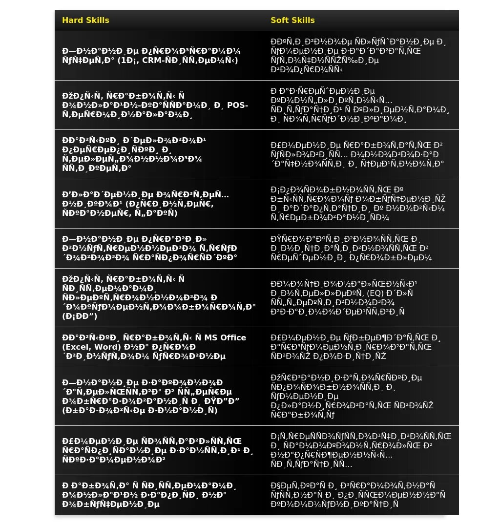 - Работа с ПК и программами: "Уверенный пользователь ПК", "знание программ MS Office (Word, Excel)", "опыт работы с CRM-системами", "знание 1С", "работа с онлайн-платформами".