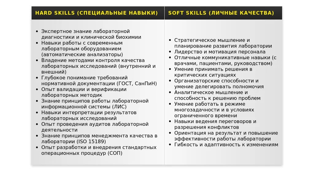 - Для вакансий в государственных больницах: "Знание нормативной базы", "Обеспечение качества лабораторных исследований", "Работа с большим объемом исследований", "Соблюдение установленных процедур", "Опыт работы в команде".