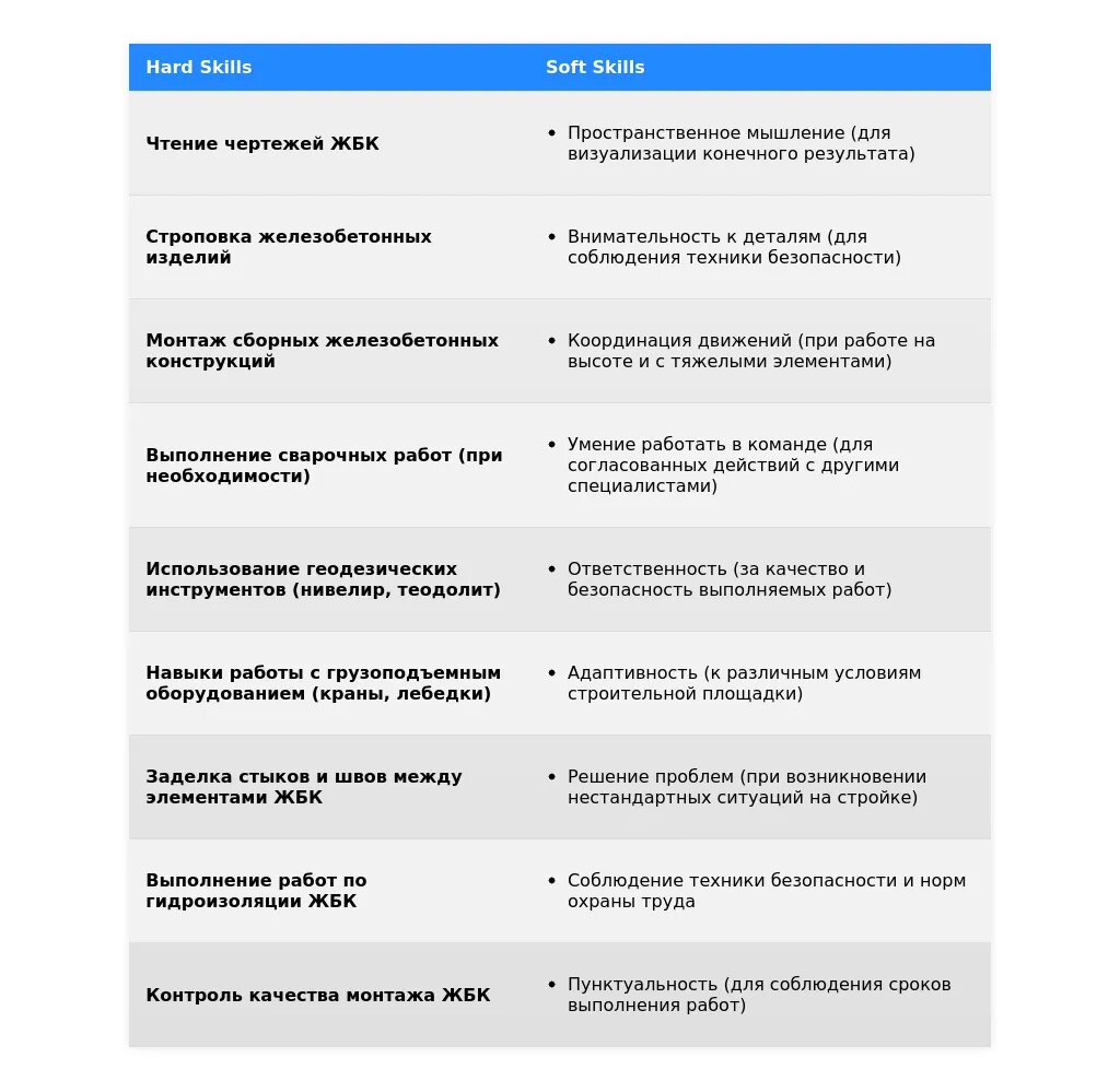 "Навыки: Монтаж железобетонных конструкций, чтение чертежей, опыт работы на высоте, соблюдение техники безопасности, ответственность, исполнительность, умение работать в команде."