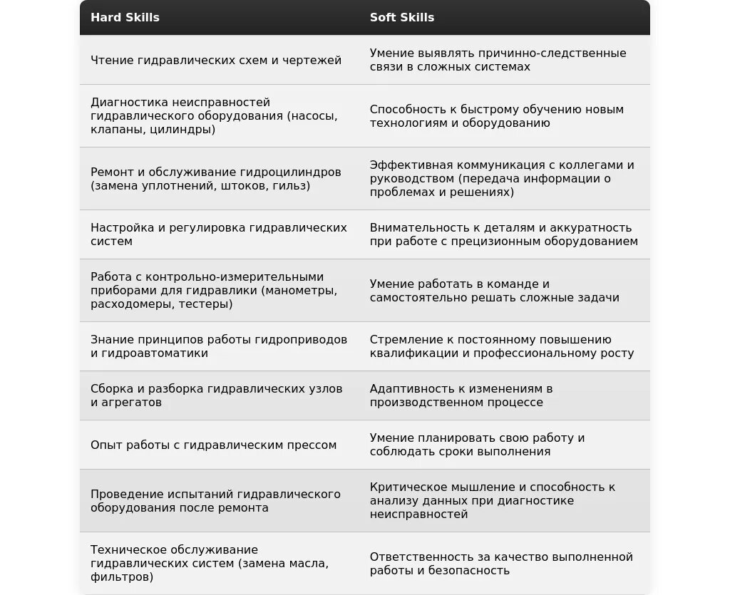 - Производственное предприятие: "Ремонт и обслуживание гидравлических систем станков", "Работа с гидравлическими прессами", "Диагностика и устранение неисправностей гидравлического оборудования", "Проведение планового технического обслуживания".