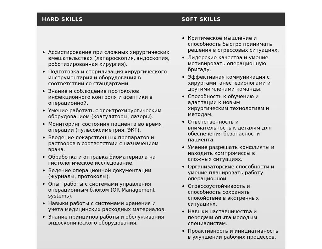 - На что делать акцент: Владение необходимыми медицинскими навыками (ассистирование, подготовка к операциям), знание СанПиН, коммуникабельность, умение работать в команде, стрессоустойчивость.
