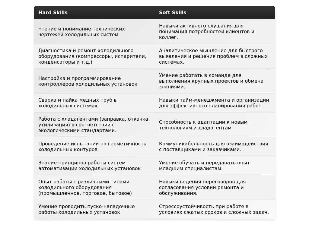 Адаптация раздела "Навыки" для механика холодильных установок