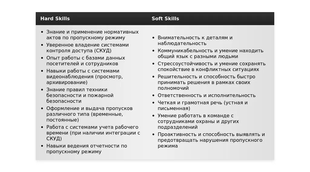 - Для вакансий в бизнес-центрах: "Обеспечение пропускного режима", "Работа с СКУД", "Контроль доступа", "Обеспечение безопасности".