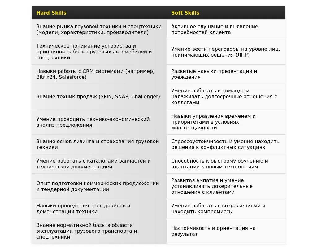 - Что обязательно включить:Ключевые навыки и компетенции, релевантные для продаж грузовых автомобилей и спецтехники (например, знание техники продаж, опыт работы с CRM, навыки ведения переговоров).