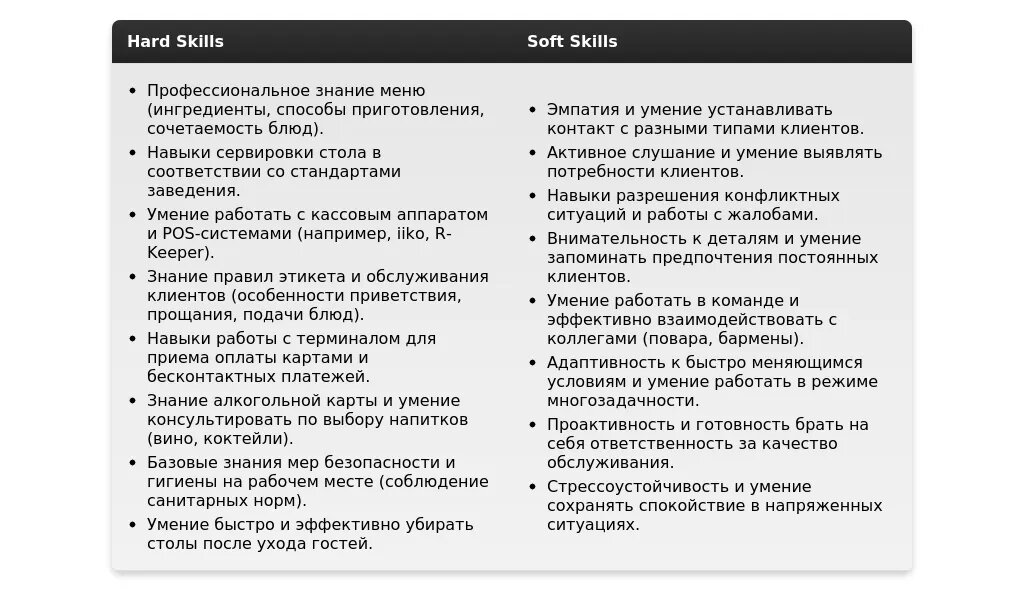 - Ресторан: "Обслуживание гостей в соответствии со стандартами ресторана", "Знание винной карты", "Умение работать с подносом".