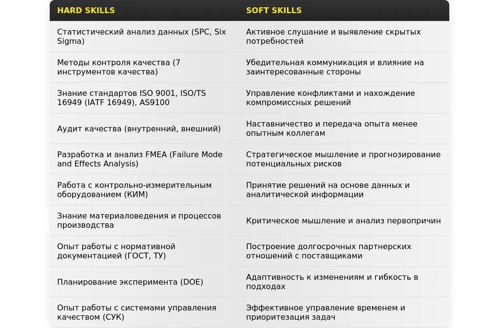 - Для вакансий, связанных с машиностроением: "Знание стандартов ISO 9001", "Опыт работы с измерительным оборудованием", "Анализ причин брака", "Разработка корректирующих мероприятий".