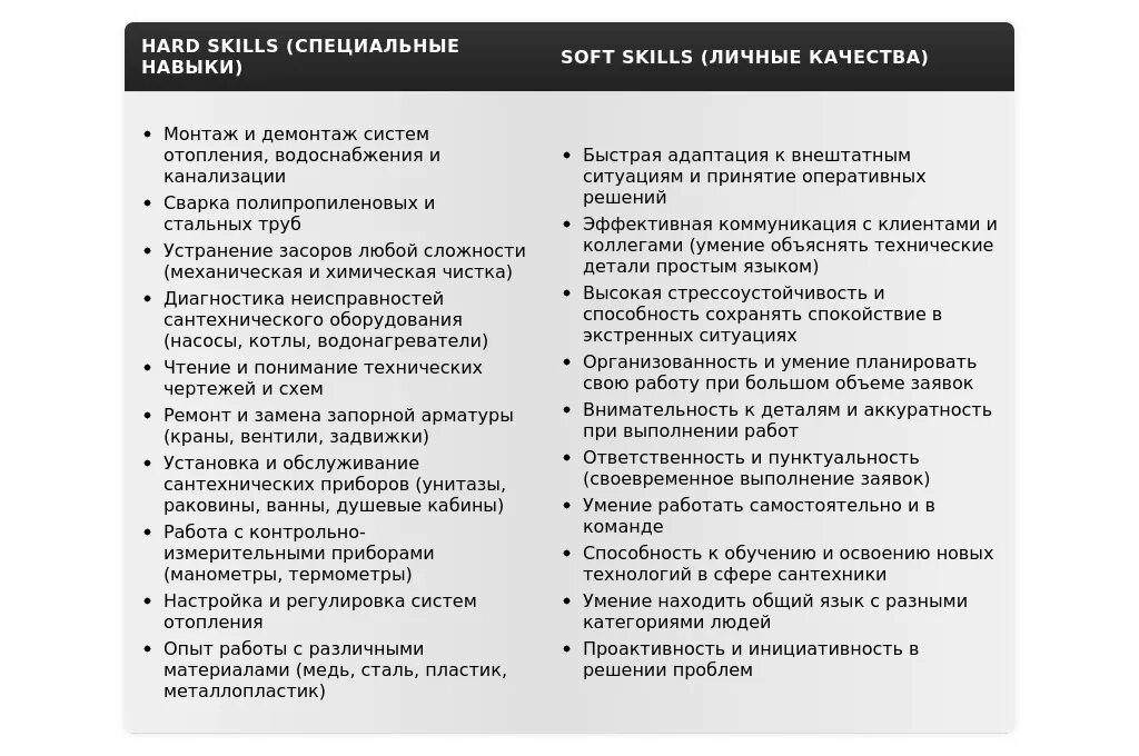 "Технические навыки: монтаж и демонтаж систем водоснабжения и отопления, сварка и резка металла, работа с электроинструментом, чтение чертежей и схем. Коммуникативные навыки: умение общаться с жильцами, работа в команде, умение быстро принимать решения в экстренных ситуациях."