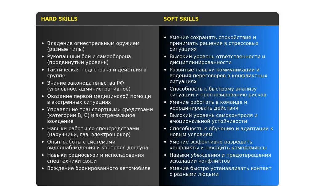 - Для работы в банках: "Обеспечение безопасности сотрудников и клиентов", "Предотвращение несанкционированного доступа", "Реагирование на чрезвычайные ситуации", "Работа с системами безопасности".