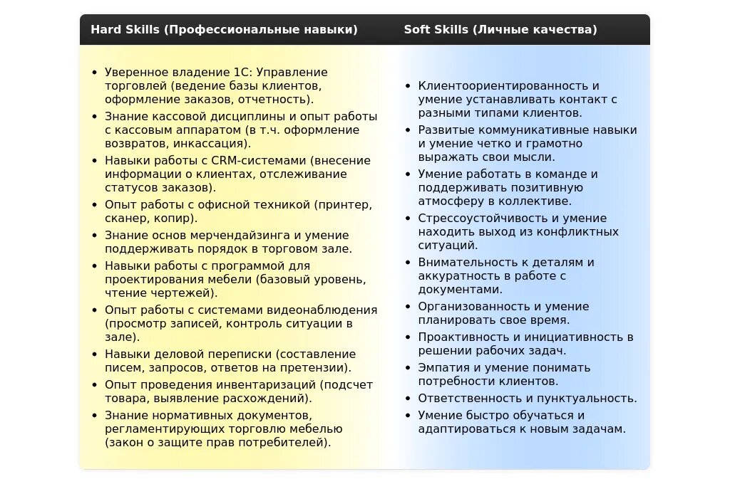 Анализ: Ключевые слова – "клиентоориентированность", "работа в команде". Даже если у вас нет опыта работы в продажах мебели, подчеркните ваш опыт работы с клиентами в других сферах, приведите примеры успешного решения конфликтных ситуаций. Опишите ваши навыки работы в команде, укажите, что вы быстро обучаетесь и готовы изучить ассортимент мебели.