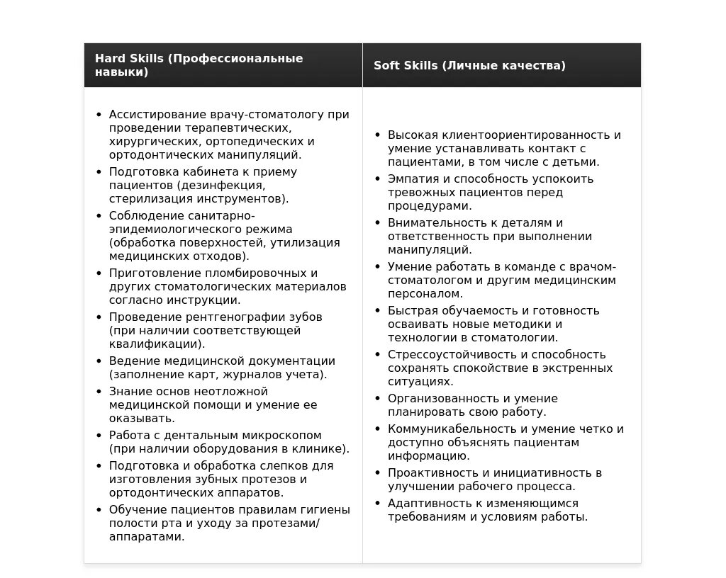 "Ассистирование врачу-стоматологу, подготовка кабинета к приему пациентов, ведение медицинской документации, знание правил асептики и антисептики, работа с ПК (MS Office, медицинские информационные системы), коммуникабельность, ответственность, внимательность."