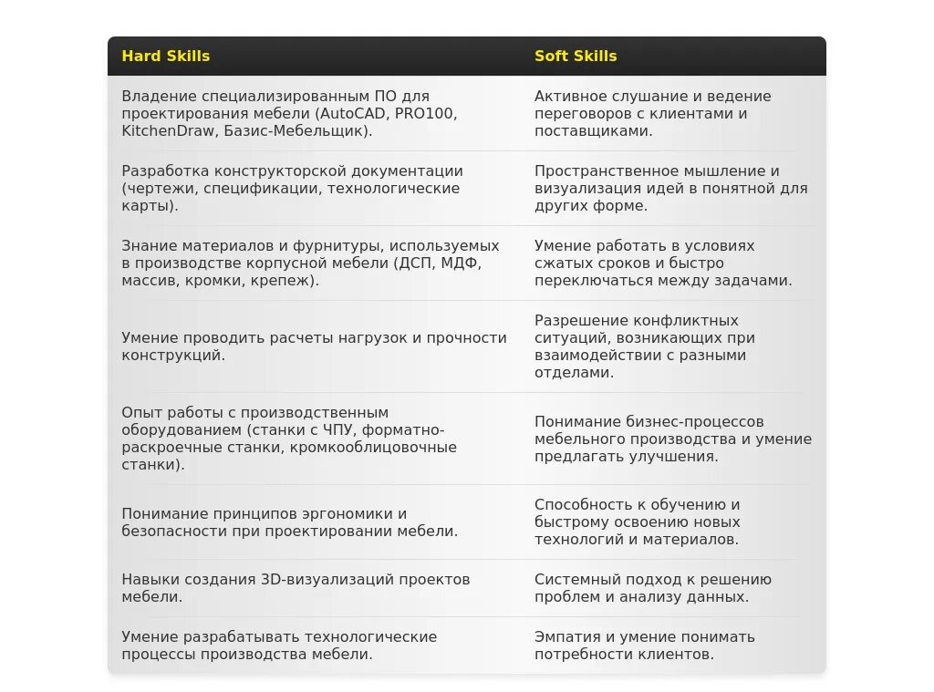 Знания: Материаловедение, технология производства мебели. Личные качества: Ответственность, внимательность, умение работать в команде.