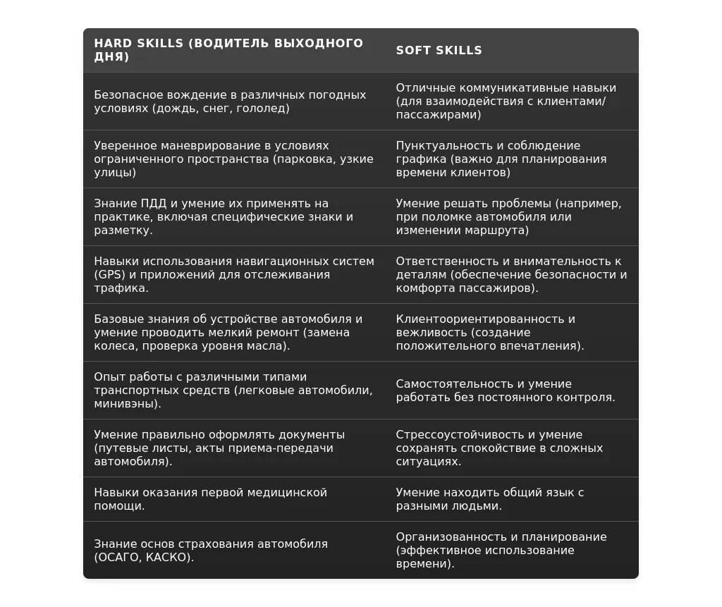 - Что обязательно включить:Ключевые навыки, релевантные для позиции водителя выходного дня (например, отличное знание города, опыт вождения различных автомобилей, безаварийный стаж).
