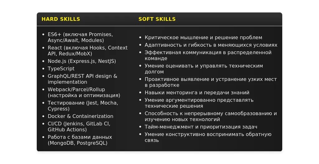 - Технические навыки: HTML, CSS, JavaScript, React, Vue.js, Angular, Node.js.