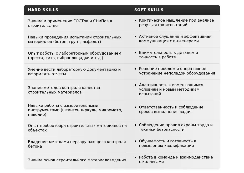 "Профессиональные навыки: Проведение испытаний бетона на прочность, водонепроницаемость, морозостойкость. Знание нормативной документации: ГОСТ 10180-2012, ГОСТ 7473-2010. Работа с оборудованием: Пресс, формы для изготовления образцов."