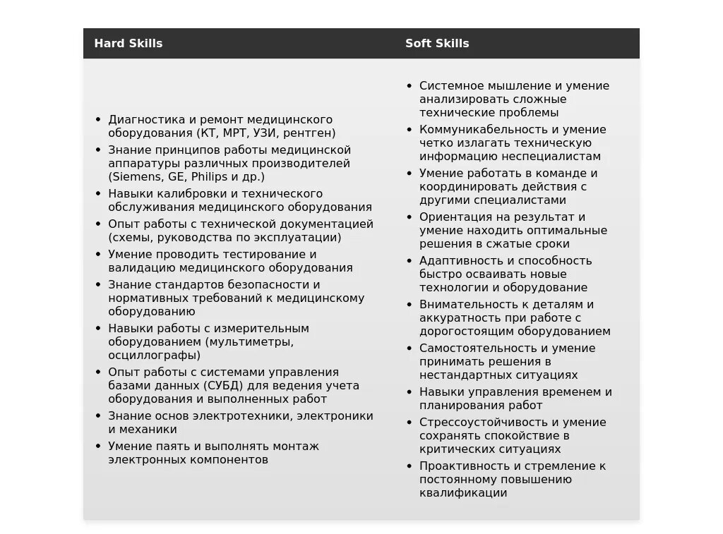 - Технические знания (устройство и принципы работы медицинского оборудования).