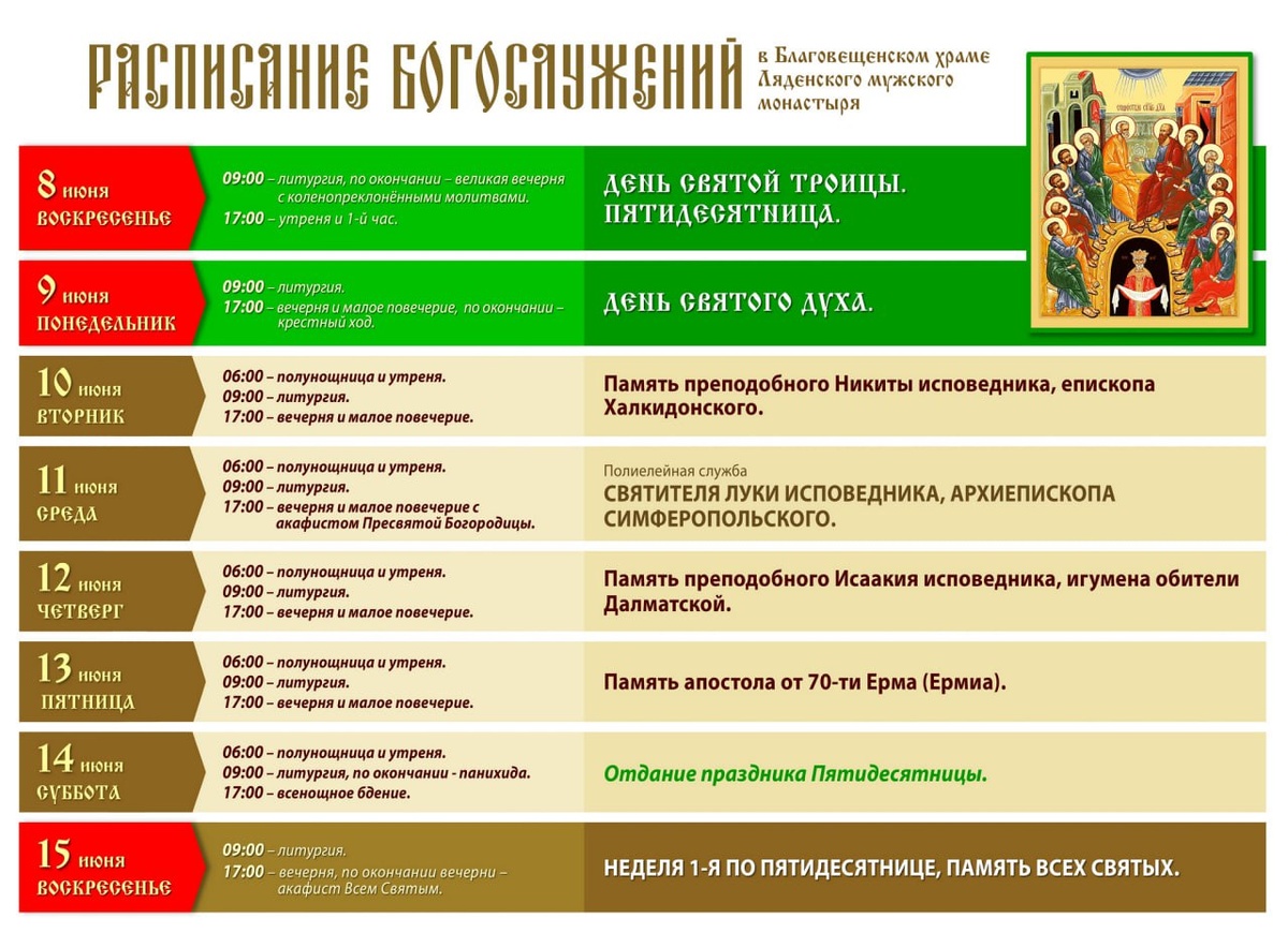 Расписание богослужений в Ляденском монастыре 8-14 июня 2025 г