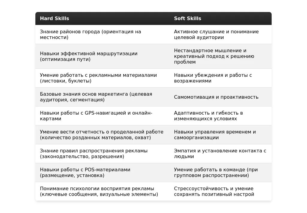 "Hard Skills: Знание города, умение ориентироваться на местности, навыки планирования маршрута. Soft Skills: Коммуникабельность, ответственность, пунктуальность, умение устанавливать контакт с людьми."