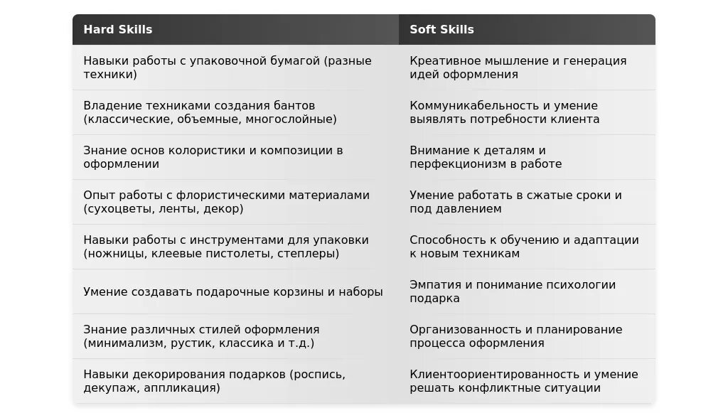- Оформитель премиум-подарков: "Опыт работы с дорогими материалами", "Создание элегантных и изысканных композиций", "Знание этикета и протокола".