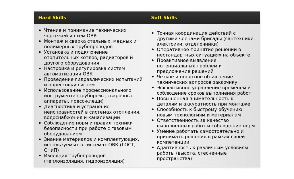 - На какие качества и навыки делать акцент: Ответственность, внимательность к деталям, умение работать в команде, знание нормативной документации, понимание принципов работы систем отопления, водоснабжения и канализации.