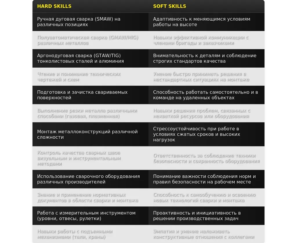 - Для вакансий, связанных со строительством: "сварка металлоконструкций", "монтаж металлоконструкций", "чтение чертежей", "работа на высоте", "соблюдение техники безопасности".