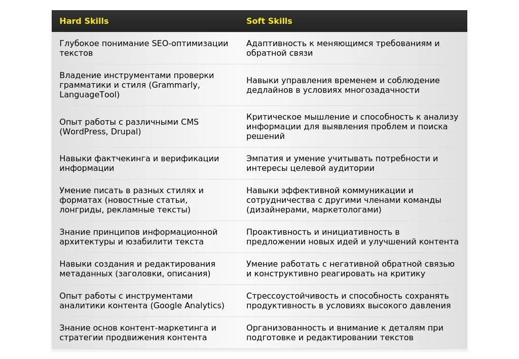 - Навыки письма и редактирования: Грамотность, стиль, умение создавать увлекательный контент.