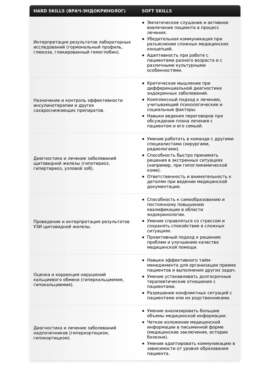 - Что обязательно включить:Ключевые навыки и компетенции (например, диагностика и лечение эндокринных заболеваний, ведение пациентов с сахарным диабетом).
