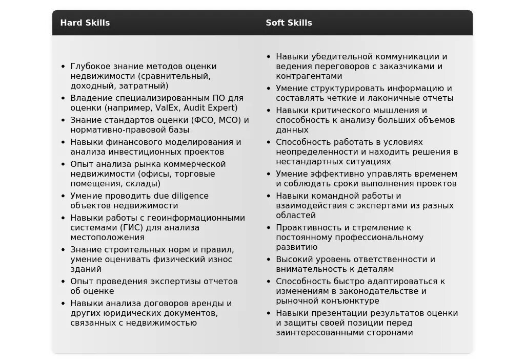 Раздел "Навыки" должен демонстрировать вашу компетентность в области оценки коммерческой недвижимости.