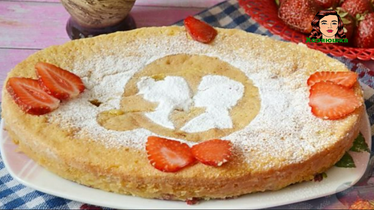 Готовый пирог с клубникой вынимаю из духовки. Даю ему немного остыть и только тогда вынимаю из формы. Украшаю пирог сахарной пудрой и кусочками клубники.
