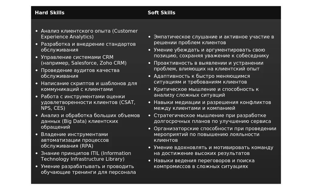 "Hard skills: CRM-системы (Salesforce, Bitrix24), анализ данных, разработка скриптов продаж. Soft skills: Коммуникабельность, работа в команде, стрессоустойчивость, решение конфликтных ситуаций."