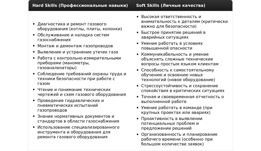 "Навыки: Обслуживание внутридомового газового оборудования, устранение утечек газа, выполнение заявок жильцов, техническое обслуживание и ремонт оборудования, знание правил безопасности при работе с газом, коммуникабельность, ответственность."