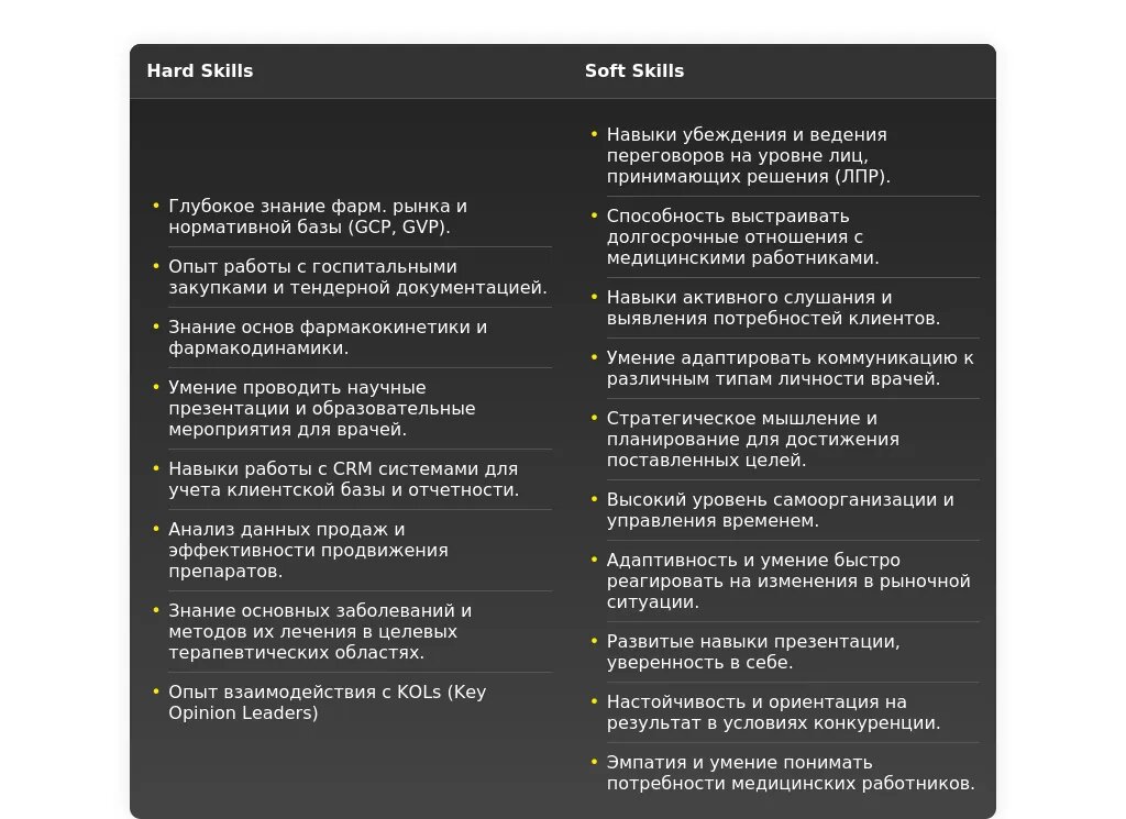 Ключевые навыки и компетенции, релевантные для позиции госпитального медицинского представителя.