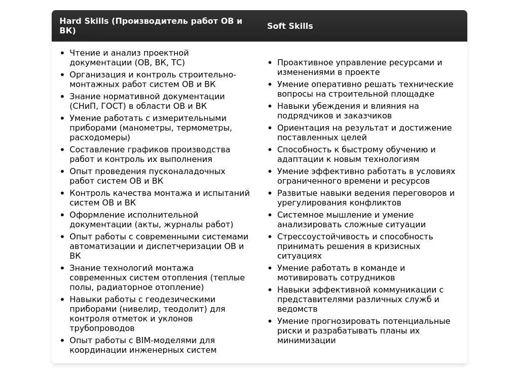 - Профессиональные навыки: Организация и контроль монтажных работ ОВ и ВК, работа с проектной документацией, сдача объекта в эксплуатацию.