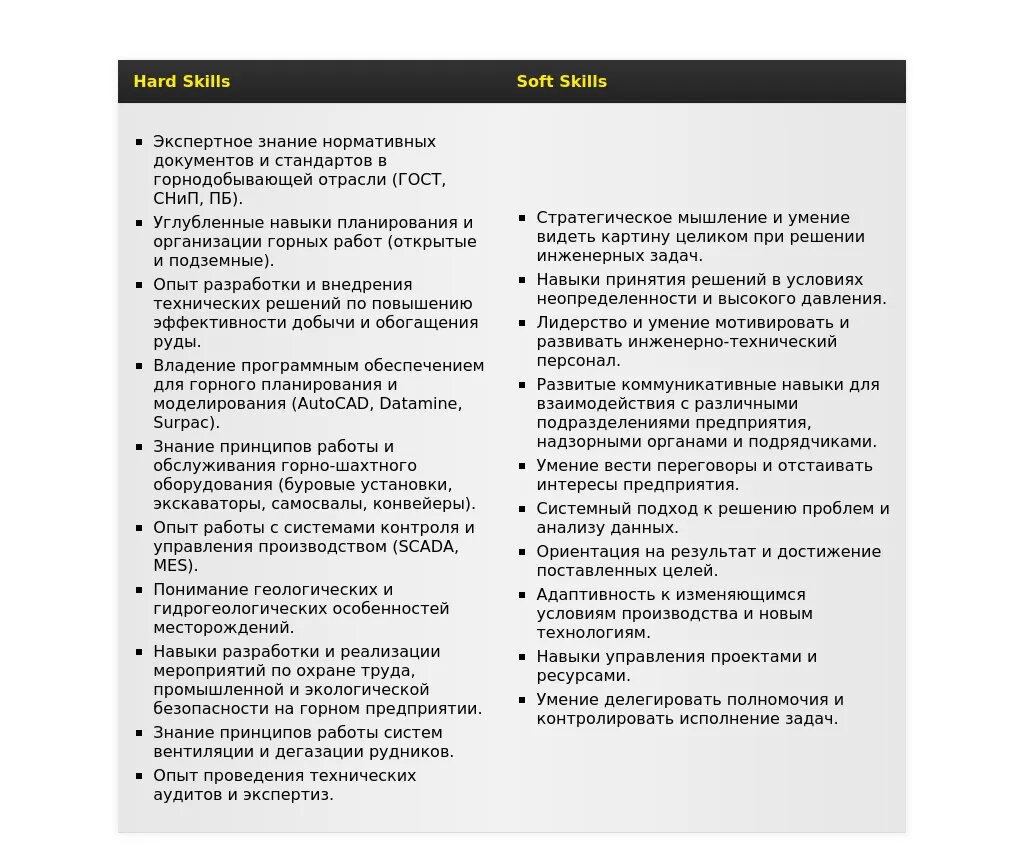 Анализ: Обязательные требования – горное образование, опыт работы в угольной промышленности, опыт подземной добычи, знание правил безопасности. Скрытые требования – знание специфики подземной угледобычи (вентиляция, дегазация и т.д.).