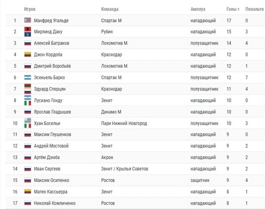 Приветствую Вас, уважаемые читатели! Сезон РПЛ закончился ещё 24 мая. Спустя две недели продолжаем подводить итоги! Сегодня немного коснемся темы лучших бомбардиров РПЛ. Список ниже, он состоит из 17 человек! Поначалу думал опубликовать стандартный из 10, но мы всегда копаем глубже! А дальше уже идет большая группа из авторов 7 голов. После двух сезонов, где лидерами по числу голов были нападающие из чемпионской команды Зенита-Малком и Матео Кассьерра, в этом сезоне мы видим, что лучшие бомбардиры из тех команд, кто не вошёл даже в тройку призеров первенства. Лучшим бомбардиром РПЛ стал костариканский нападающий московского Спартака Манфред Угальде. Но стоит отметить, что основная часть голов пришлась на первую половину чемпионата. До зимнего перерыва Угальде -забил 15 голов. После возобновления чемпионата Манфред Угальде смог отличиться только в первом матче после зимней паузы в 19 туре и в заключительном 30-м туре. После ухода Соболева в Зенит Манфред Угальде "расцвел" и был главной