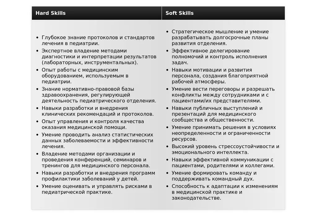 Если у вас есть опыт работы в педиатрии, сделайте акцент на ваших достижениях, профессиональных навыках и специализации. Опишите ваш опыт руководства коллективом и организации работы отделения.