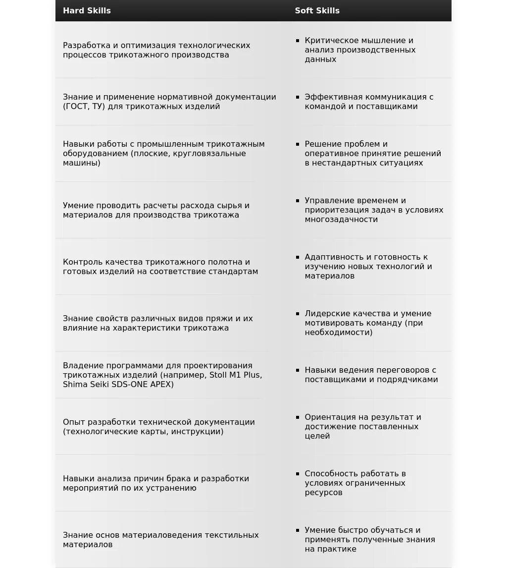 Адаптированный раздел "Навыки": Технические навыки: _***Знание устройства и принципов работы трикотажного оборудования (эксперт)***_, _***ремонт и обслуживание оборудования (эксперт)***_, разработка технической документации (продвинутый).
