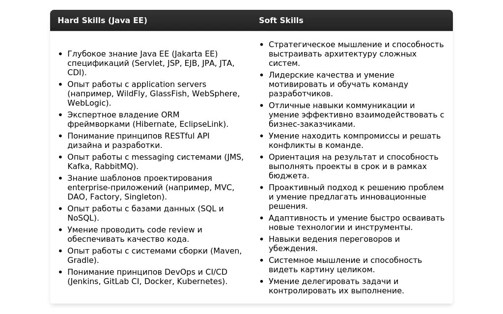- Java EE архитектор (микросервисы, Docker) – Подчеркивает опыт в архитектуре и современных технологиях.