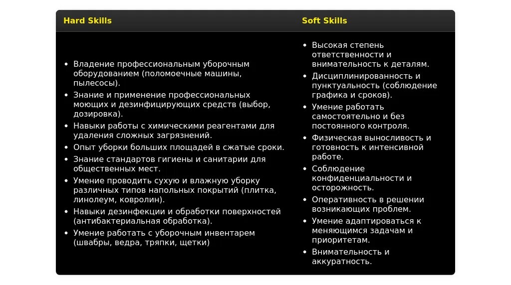 - Перечислите свои ключевые навыки. Укажите навыки, которые наиболее важны для данной вакансии, например, знание чистящих средств, умение работать с поломоечными машинами, физическая выносливость.
