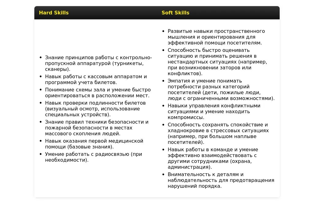 Раздел "Навыки" должен четко демонстрировать ваши ключевые компетенции, необходимые для работы билетером. Адаптируйте его под требования конкретной вакансии, выделив наиболее важные навыки.