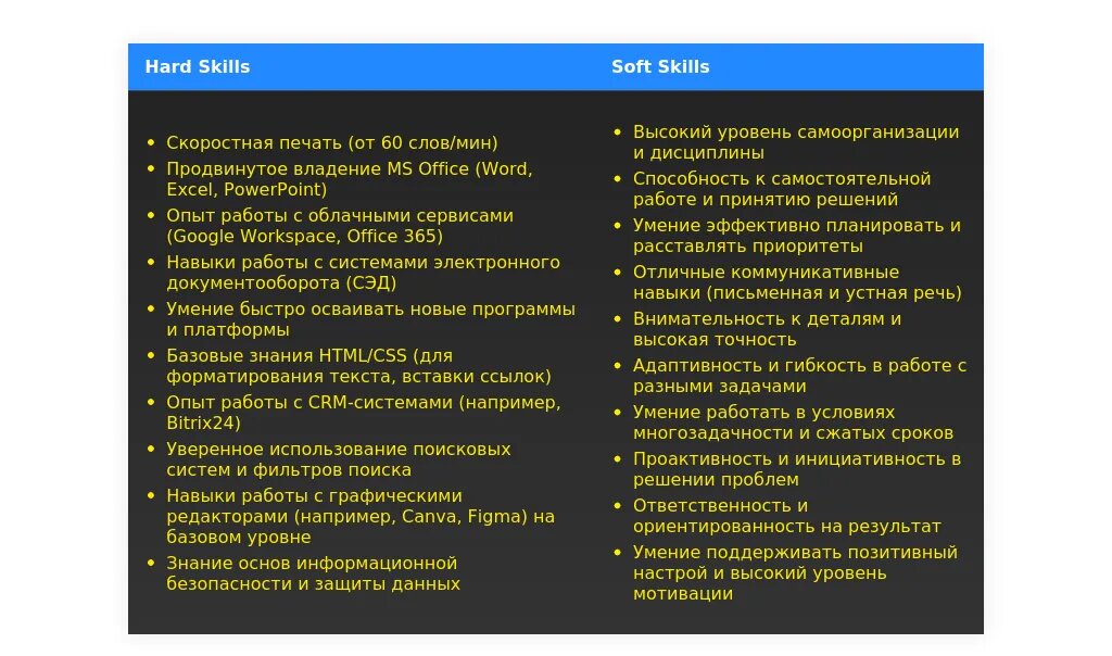 - Конкретные программы и навыки: Excel, Word, Google Docs, специализированное ПО.