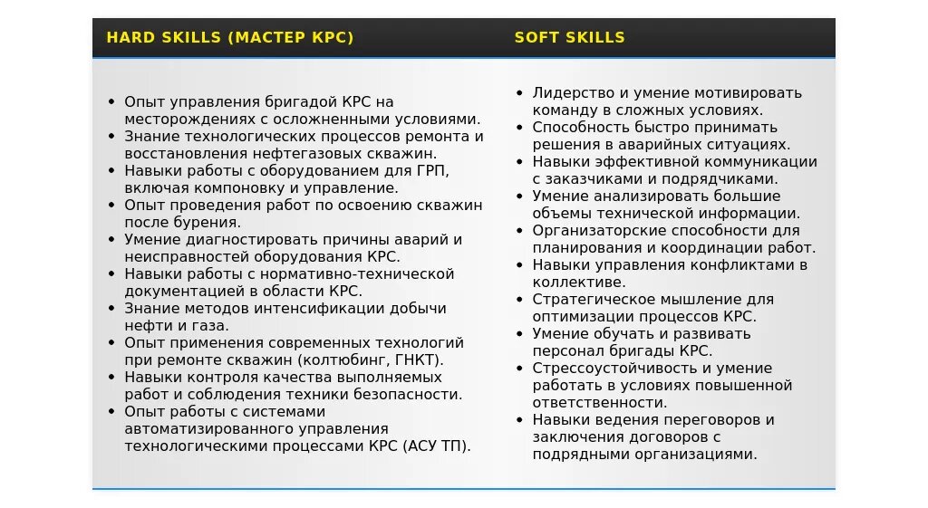 - Для вакансий, связанных с управлением: "Руководство бригадой КРС", "Организация работ на объекте", "Контроль за соблюдением техники безопасности", "Принятие решений в сложных ситуациях", "Обучение и развитие персонала".