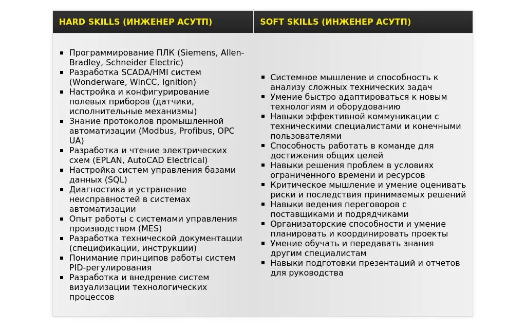 - Инженер АСУ ТП: "разработка и внедрение систем автоматизации", "наладка и пуско-наладка оборудования", "оптимизация работы системы управления", "программирование ПЛК", "работа с SCADA-системами".
