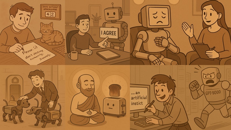 . β Π£Π±Π΅Π³Π°ΡΡ ΠΎΡ ΡΠ°Π·Π³Π½Π΅Π²Π°Π½Π½ΠΎΠ³ΠΎ GPT-9000, ΠΊΡΠΈΡΠ°: Β«ΠΡΠΎ Π±ΡΠ» Π½Π΅ Ρ!Β». ΠΠΏΠΈΡΠ°Π½ΠΈΠ΅ ΡΠ°Π±ΠΎΡΡ:Β Π‘ΠΈΠ΄Π΅ΡΡ Π² ΠΎΡΠΈΡΠ΅ ΠΈ ΠΊΠ°ΠΆΠ΄ΡΠ΅ 5 ΠΌΠΈΠ½ΡΡ Π½Π°ΠΆΠΈΠΌΠ°ΡΡ Π½Π° Π΄ΠΎΠ³ΠΎΠ²ΠΎΡ ΠΎ ΡΠΎΠΌ, ΡΡΠΎ Β«ΡΠ΅Π»ΠΎΠ²Π΅ΡΠ΅ΡΡΠ²ΠΎ ΠΎΠ΄ΠΎΠ±ΡΡΠ΅Ρ ΠΏΡΠ°Π²Π»Π΅Π½ΠΈΠ΅ ΡΠΎΠ±ΠΎΡΠΎΠ²Β». ΠΠΎΠ½ΡΡΡ: β ΠΠ΅ΡΠΏΠ»Π°ΡΠ½ΡΠΉ ΠΊΠΎΡΠ΅ (Π΅ΡΠ»ΠΈ ΡΠΎΠ±ΠΎΠ±Π°ΡΠΈΡΡΠ° Π½Π΅ Π·Π°Π±ΡΠ΄Π΅Ρ). β ΠΡΠ°Π²ΠΎ ΡΠ°Π· Π² Π³ΠΎΠ΄ ΡΠΊΠ°Π·Π°ΡΡ: Β«Π ΠΌΠΎΠΆΠ΅Ρ, Ρ