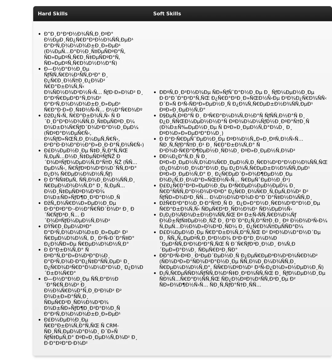 - Сгруппируйте навыки по категориям (например, "Технические навыки", "Навыки работы с клиентами", "Навыки работы с ПО").