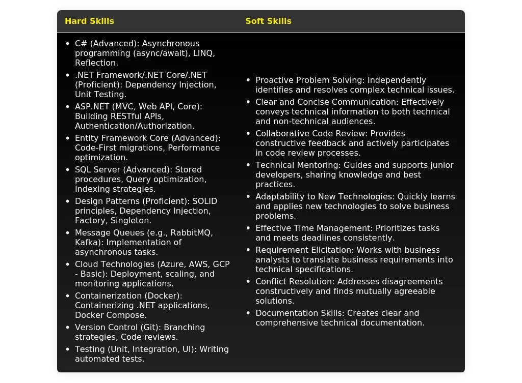 - Технологии: Укажите ключевые технологии, которыми владеете, например, .NET Core, ASP.NET, C#.